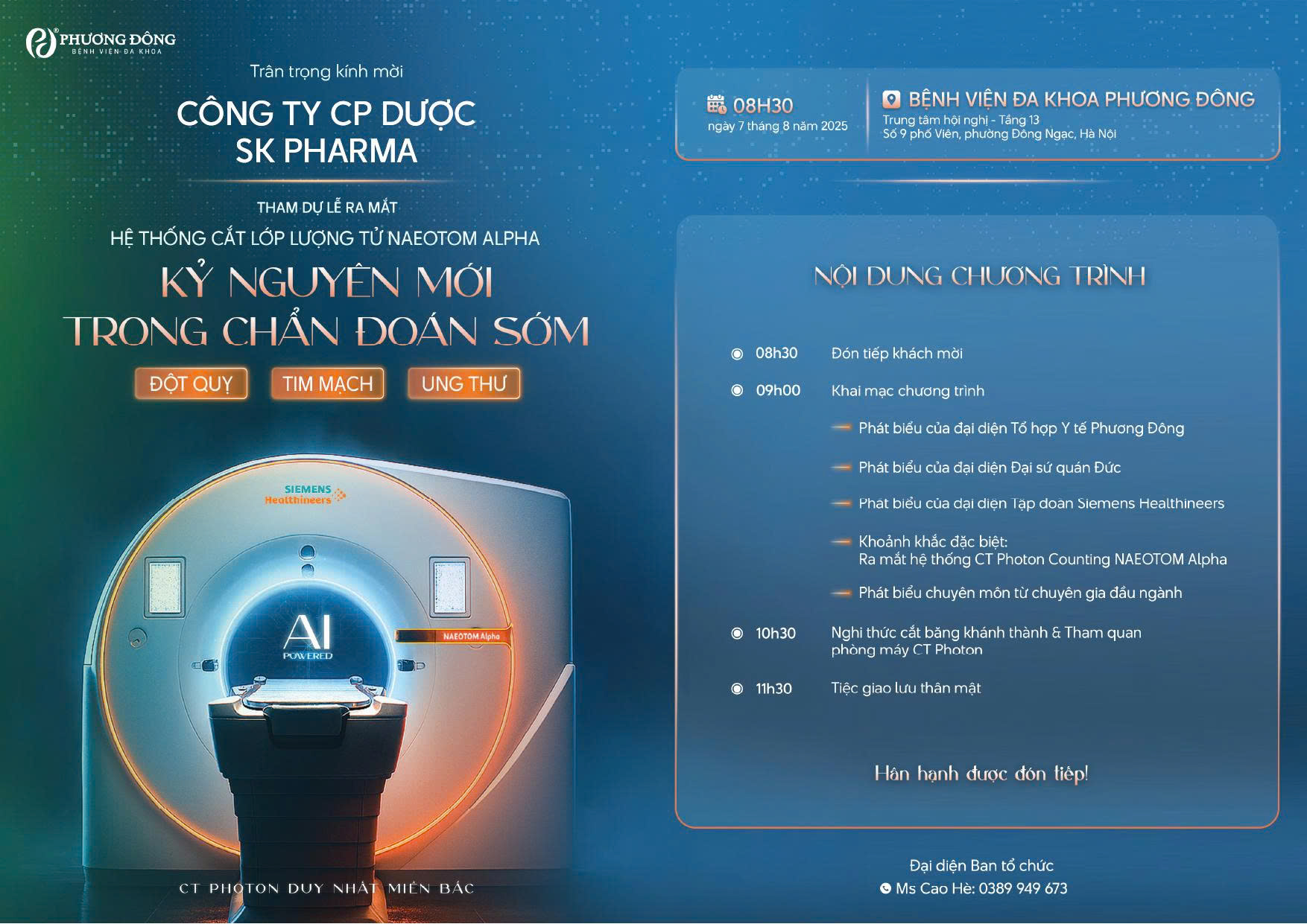 Ngày 07/08/2025, Công ty Cổ phần Dược SK Pharma vinh dự tham dự Lễ ra mắt Hệ thống Cắt lớp lượng tử NAEOTOM Alpha – thiết bị CT Photon đầu tiên và duy nhất tại miền Bắc, được tổ chức tại Bệnh viện Đa khoa Phương Đông (Hà Nội).
